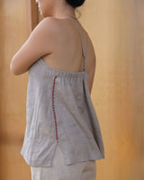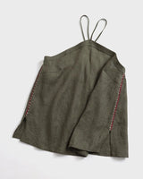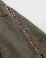 ネックラインには複数のステッチを施し、柔らかなリネン素材に程よいハリ感を与えています。