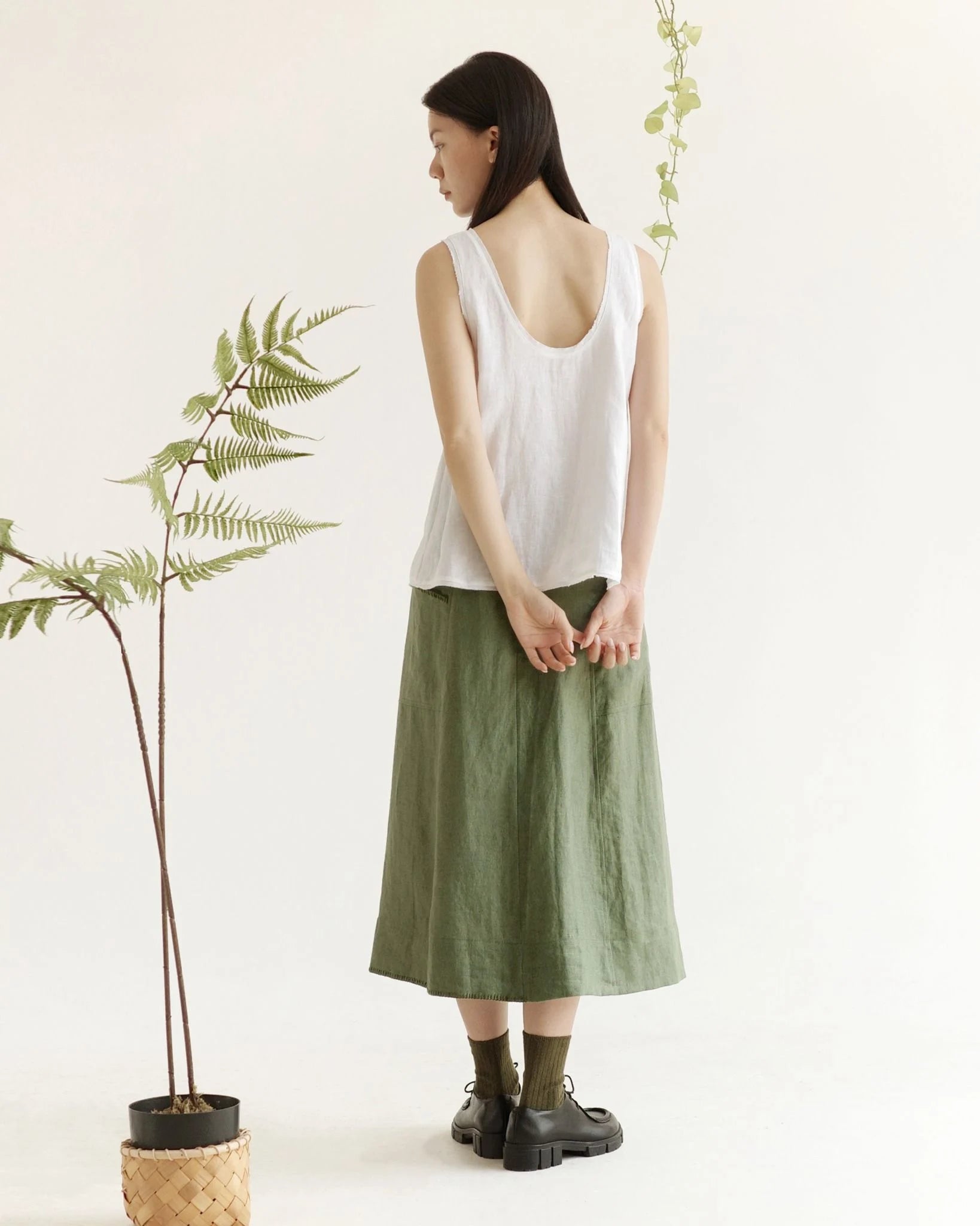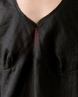 ネックラインとアームホールは、斜め方向に裁断したリネンでバイアステープ処理されており、自然な“ラフさ”と、やわらかいエッジの風合いが魅力です。