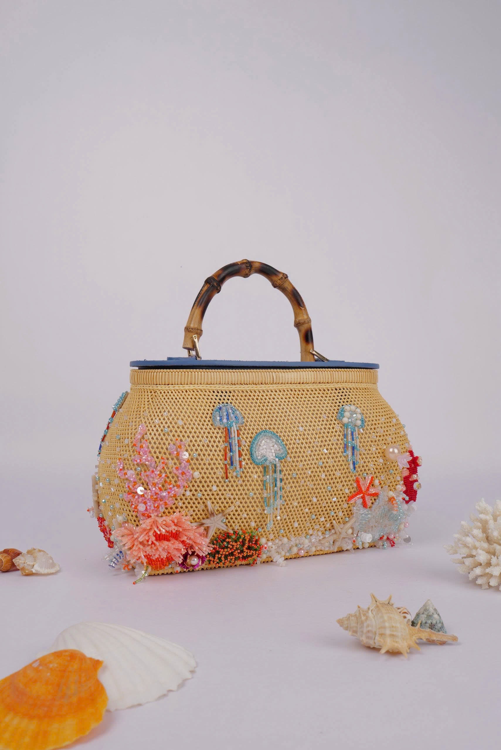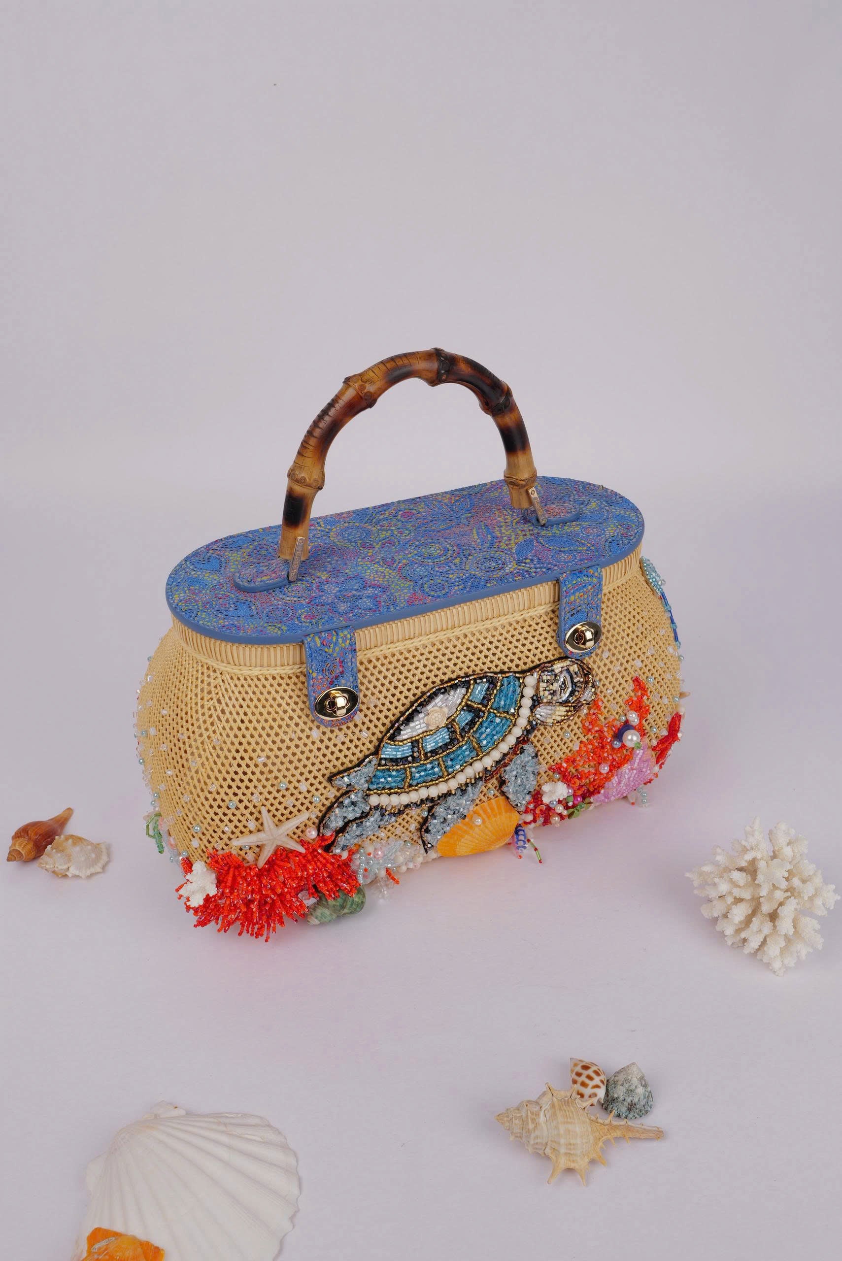 本コレクションの最大の特徴は、現地の職人が一針一針手作業で施した、立体的なビーズ刺繍と装飾です。 ラタンやバンブーといった天然素材の素朴な風合いに、ジュエリーのような輝きをプラス。ウミガメ(Mom Turtle)や海の生き物たちが、まるでそこで泳いでいるかのような躍動感を表現しました。