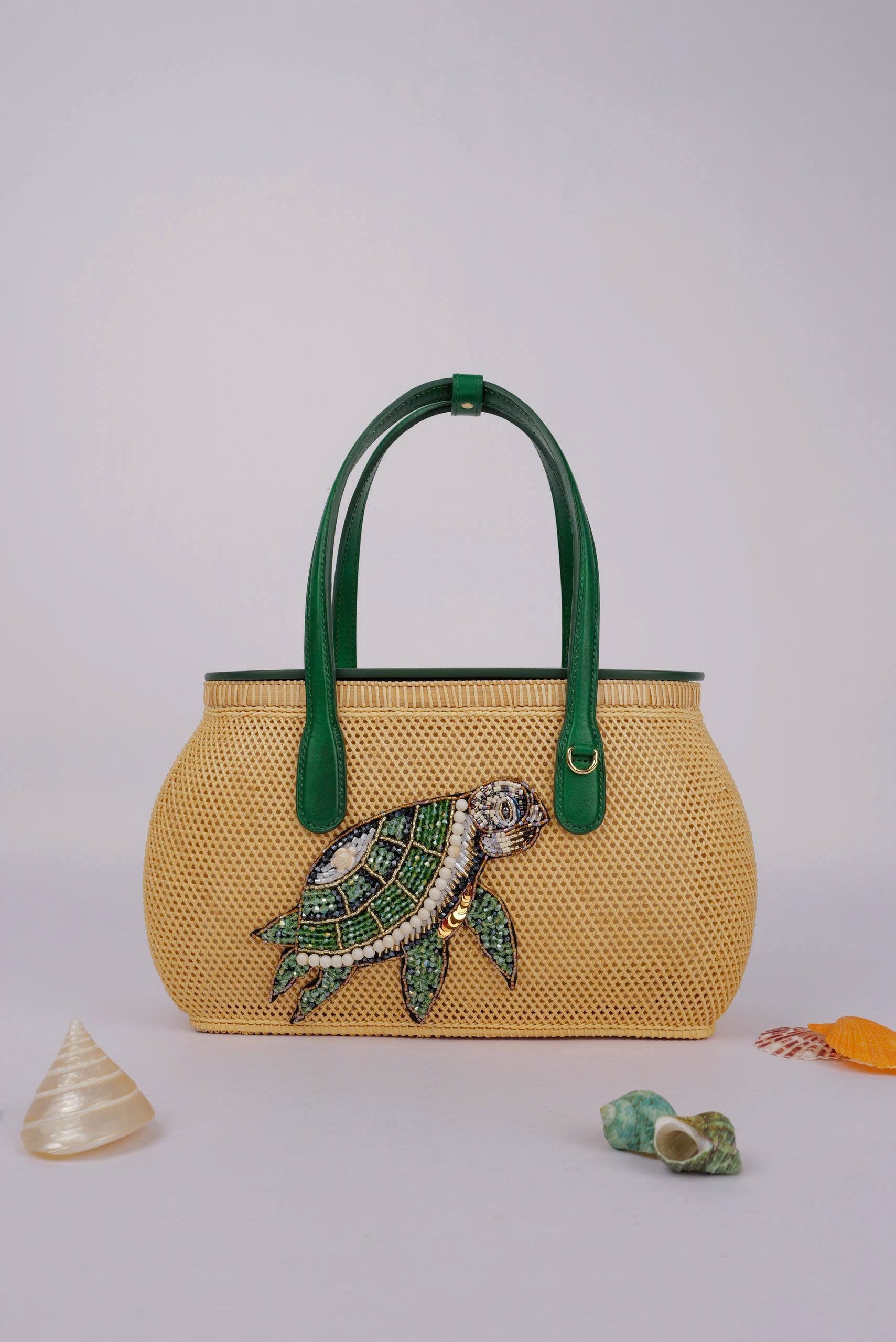 【受注生産】【チャリティアイテム】Xuân Thị HandMade Crafts | スアン・ティ ハンドメイドクラフト コンダオ・コレクション Mom Turtle [Leather Edition] エメラルドグリーン 本革ハンドル かごバッグ